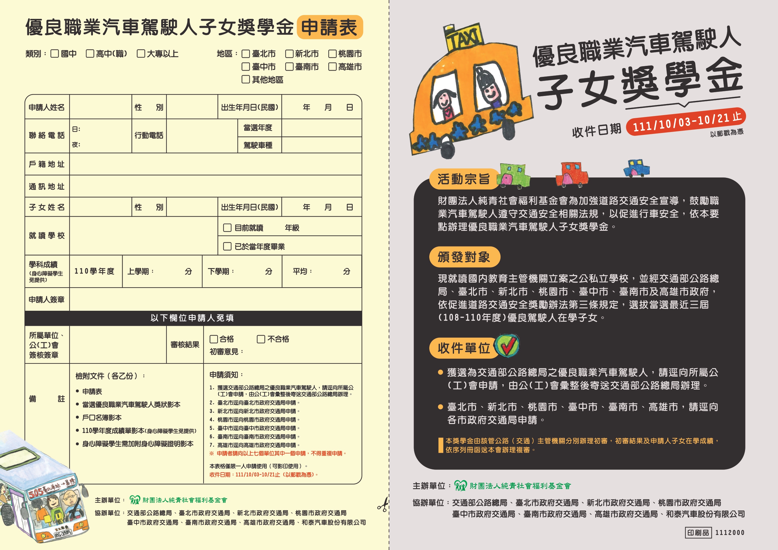 2022年優良職業汽車駕駛人子女獎學金申請開始囉!